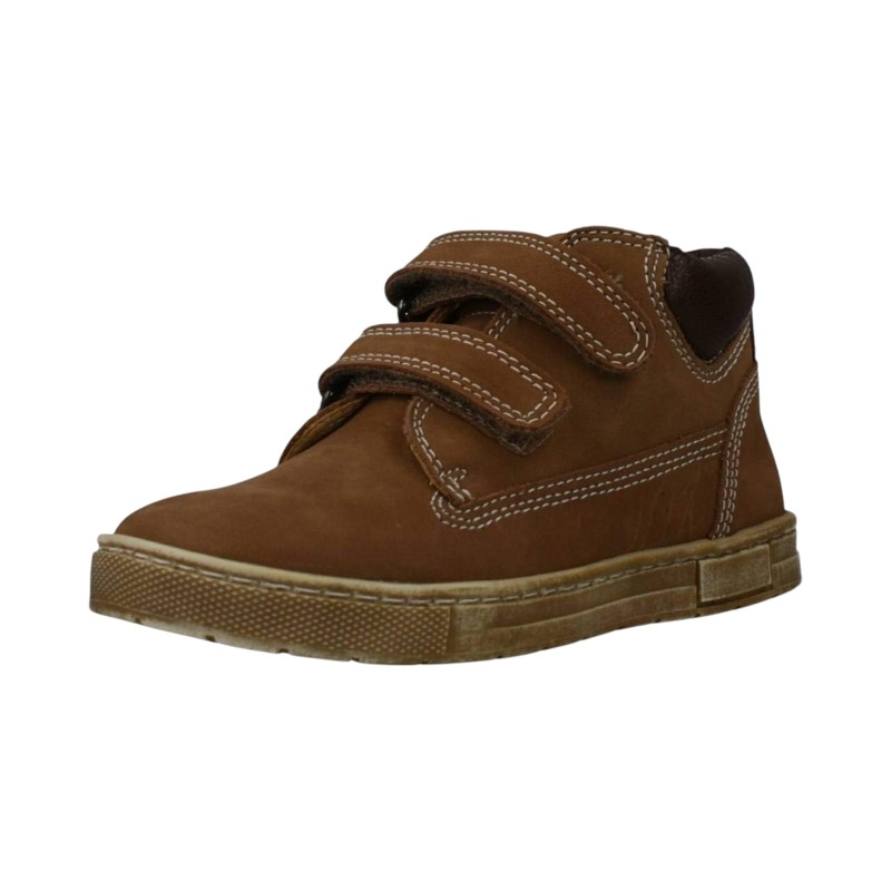 Polacchino in similpelle nappa, linguetta, 2 fettucce in velcro, cuciture a vista, punta tonda, tallone rinforzato, suola in gomma.
