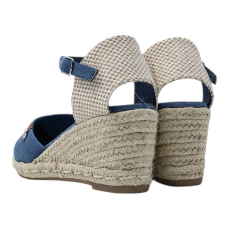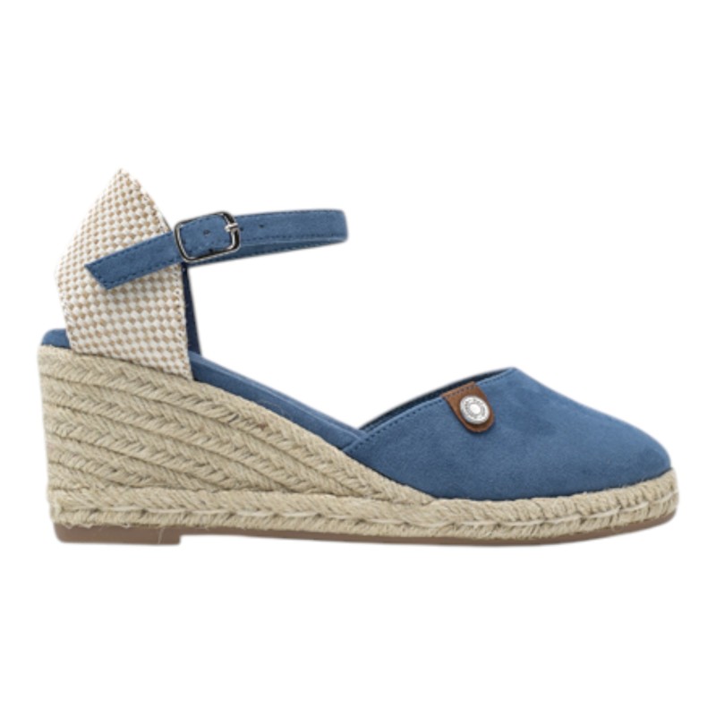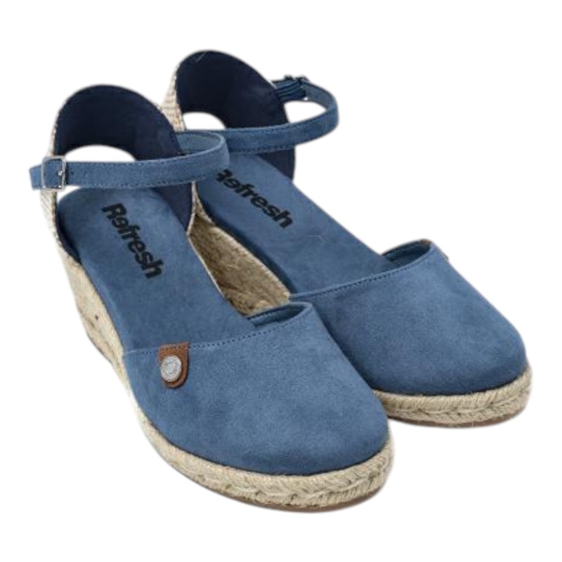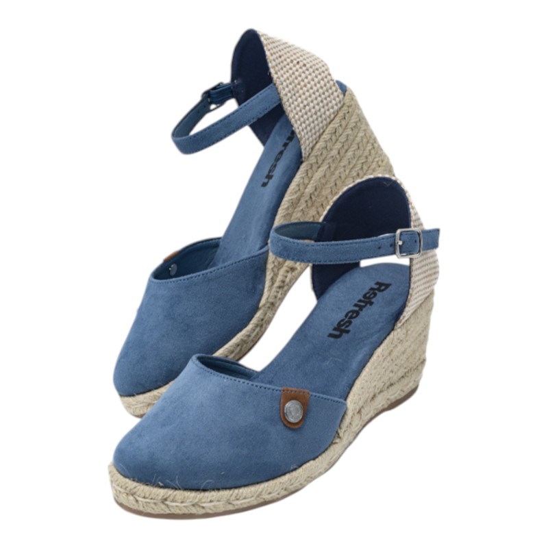 Espadrillas in similpelle scamosciata, punta tonda, cinturino alla caviglia con fibbia, suola con zeppa in iuta.