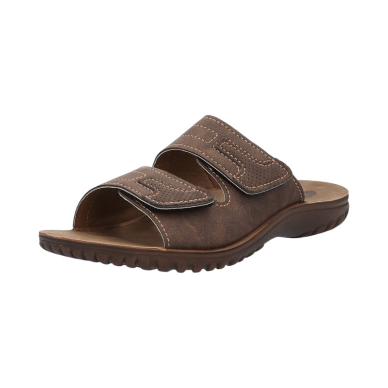 Ciabatta in tessuto sintetico, 2 fettucce in velcro, sottopiede in pelle, suola in gomma.