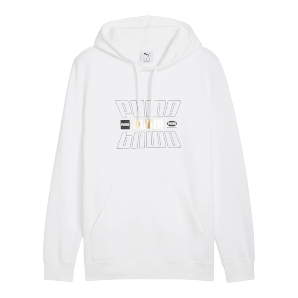 Felpa in cotone felpato, collo con cappuccio e coulisse, spalle regolari, maniche lunghe, logo stampato a contrasto, orlo dritto.
