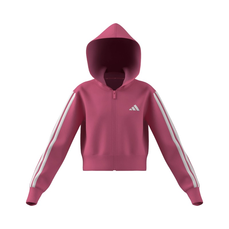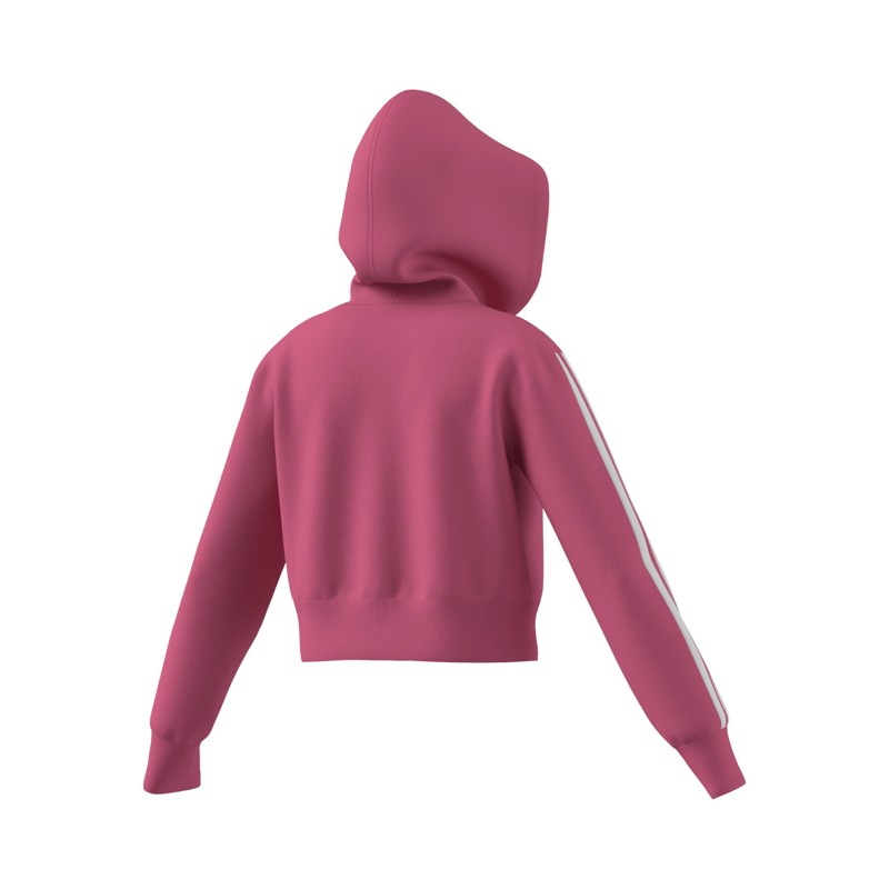 Felpa in cotone french terry, collo con cappuccio, spalle regolari, maniche lunghe, 3 iconiche stripes laterali a contrasto, polsini elasticizzati, chiusura con zip, logo trifoglio a contrasto, orlo dritto.