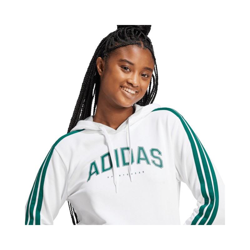 Felpa in cotone french terry, collo con cappuccio e coulisse, spalle regolari, maniche lunghe, iconiche stripes sulle maniche, logo a contrasto, tasca a marsupio, orlo dritto.