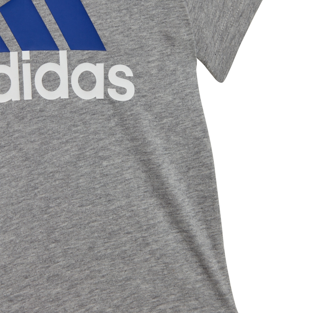 Set adidas in morbido jersey di cotone, comodo e pratico per i più piccoli. La combinazione di grigio e blu regala uno stile sportivo e moderno, perfetto per ogni momento di gioco.