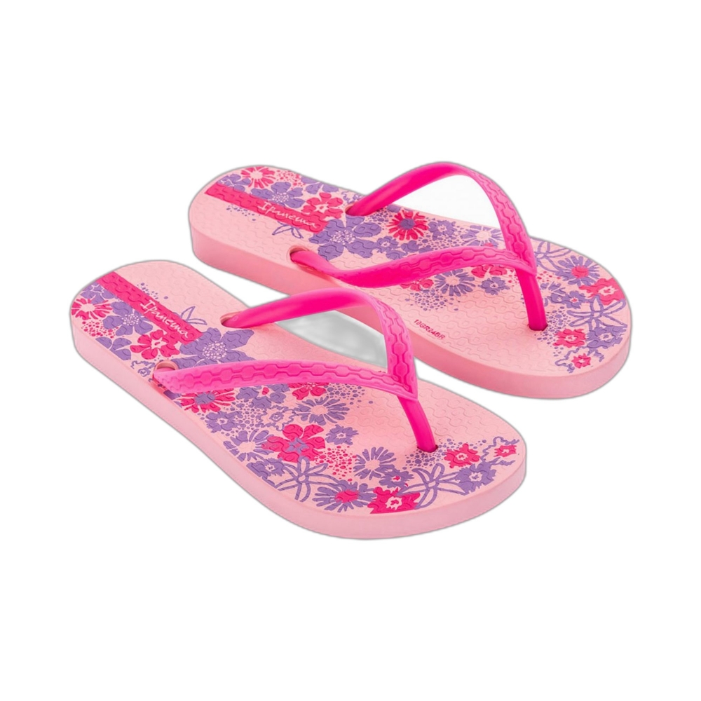 Infradito in flexpand con stampe a fiori e righe che esplodono nella Ipanema Happy, colori sono arricchiti da strisce metallizzate, suola caratterizzata dall'esclusivo motivo del marciapiede che si trova lungo l'iconica spiaggia di Ipanema.