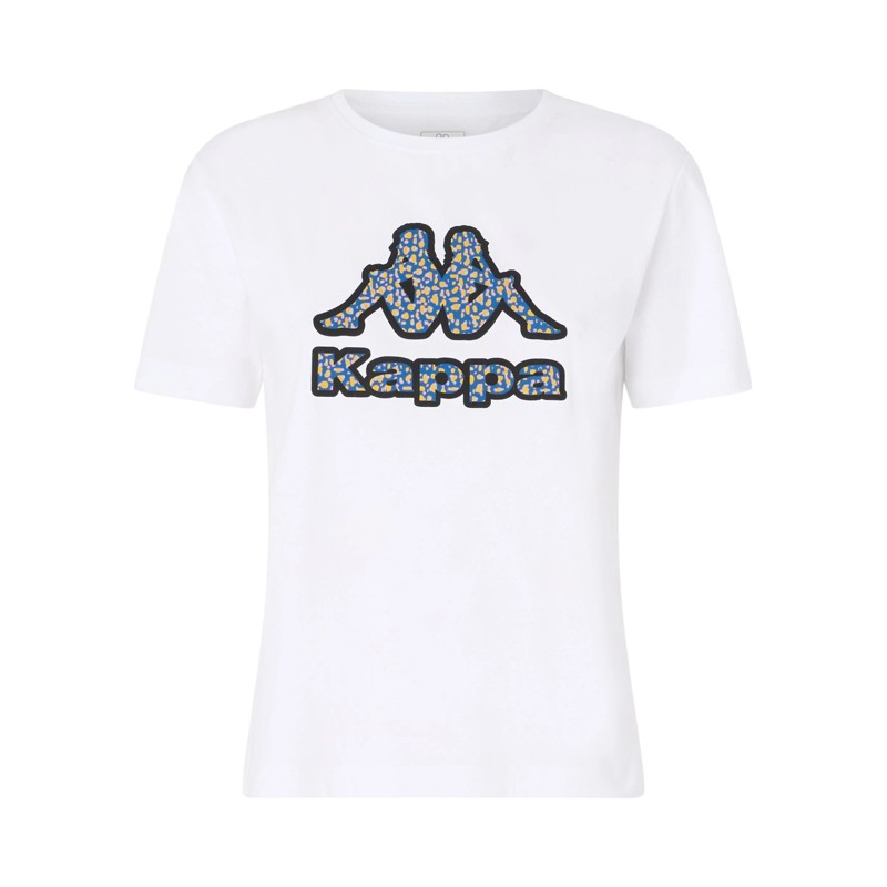 T-shirt in cotone jersey, scollatura a girocollo, spalle regolari, maniche corte, logo Kappa a contrasto, orlo dritto.