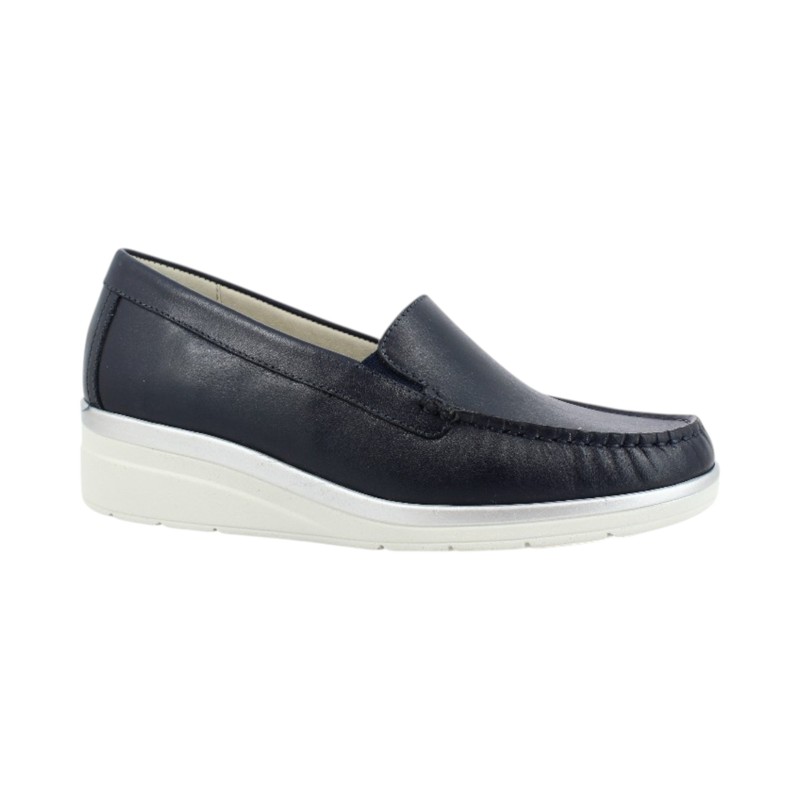 Mocassino comfort in pelle nappa laminata, vaschetta in rilievo, mini bande laterali elasticizzate, tallone rinforzato, suola in gomma.
