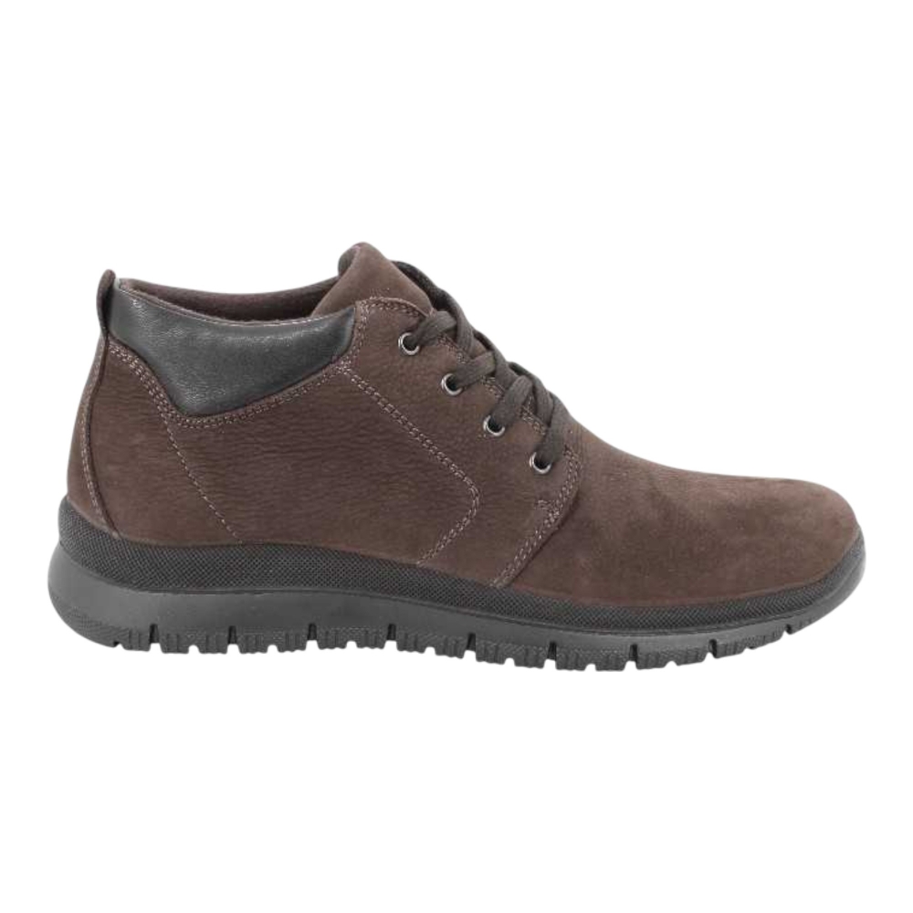 Polacchino in nubuk, linguetta, chiusura con lacci, punta tonda, tallone rinforzato, profili in pelle, suola in gomma.