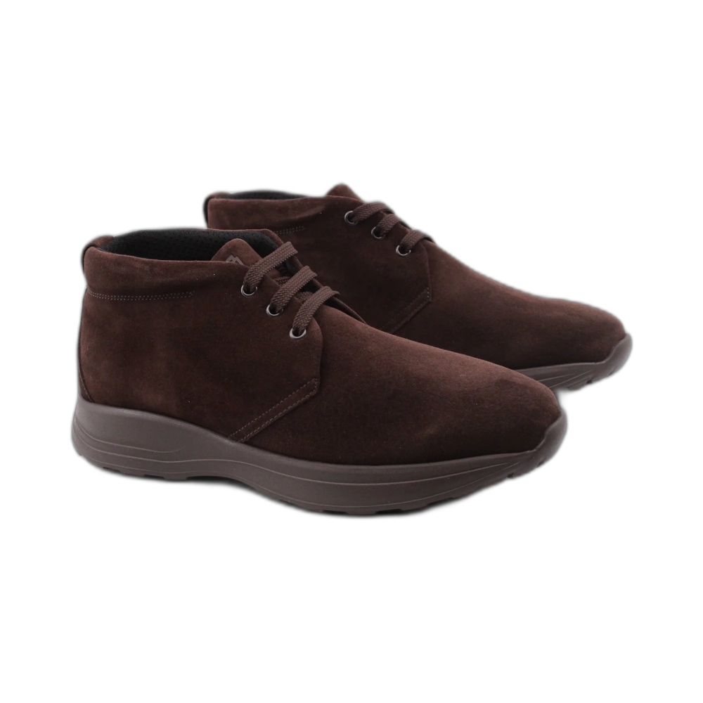 Polacchino in vero camoscio, linguetta, chiusura con lacci, punta tonda, tallone rinforzato, suola in gomma.