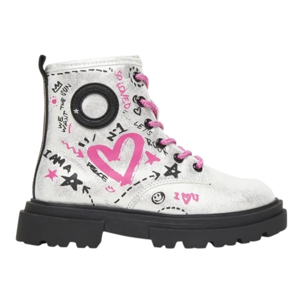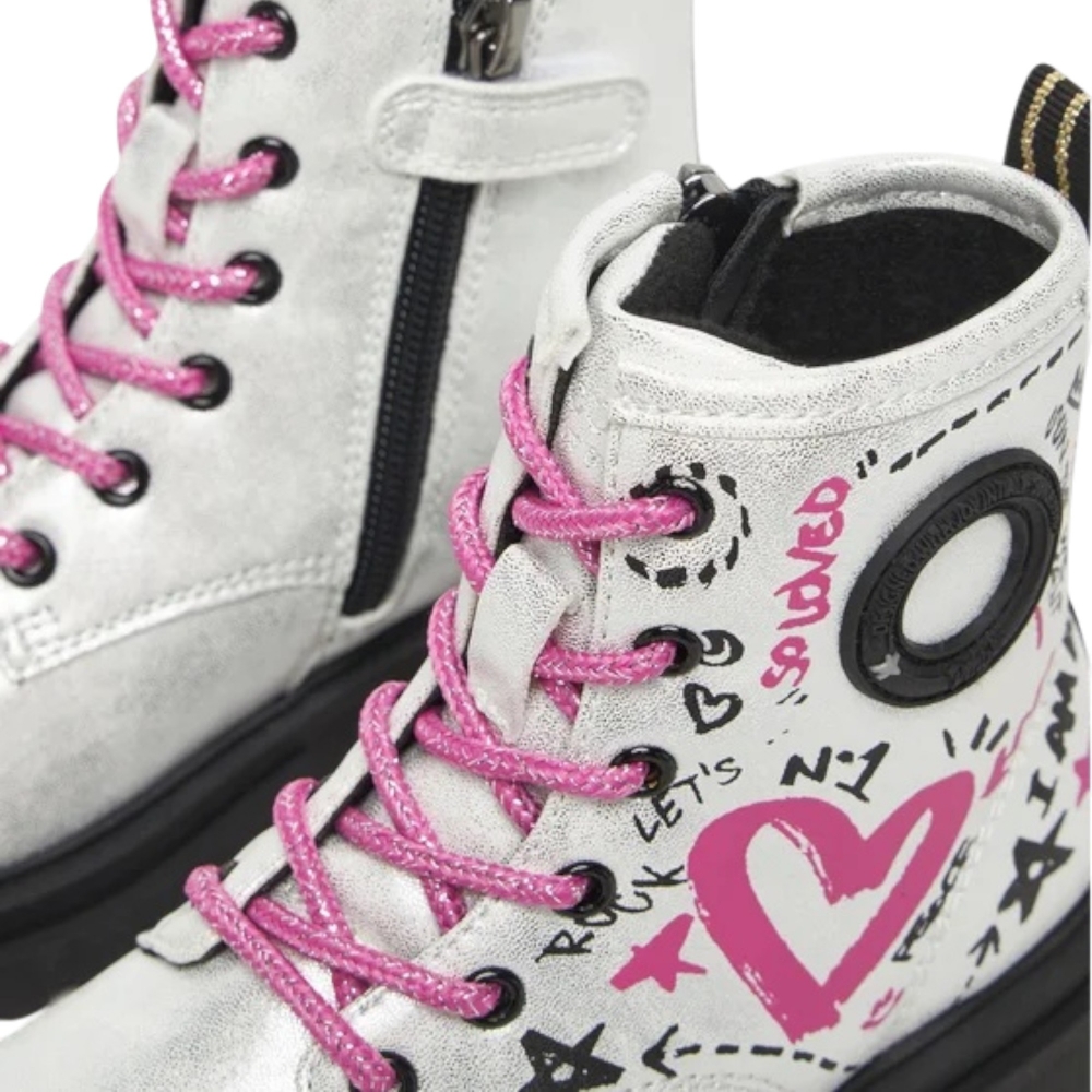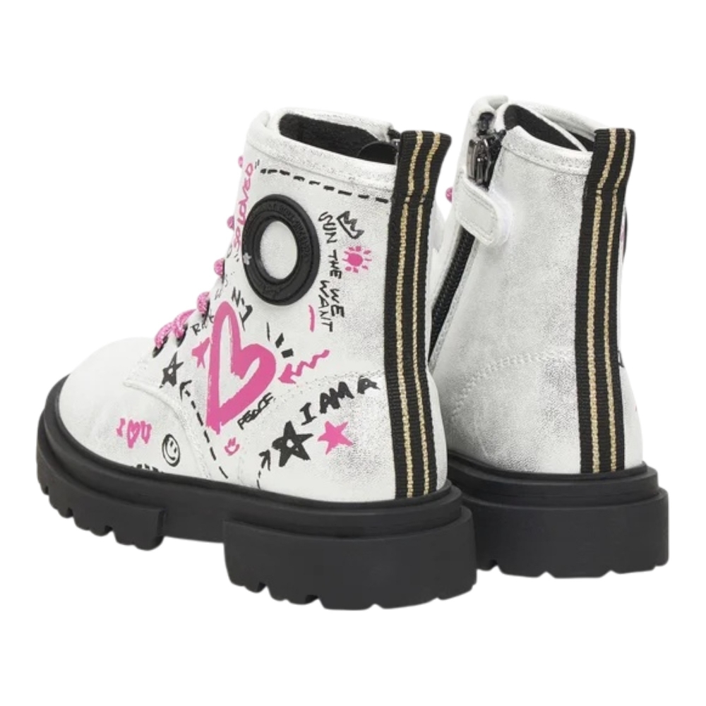 in materiale sintetico laminato argento con dettagli fucsia. Look trendy e brillante, ideale per l’inverno delle ragazze.