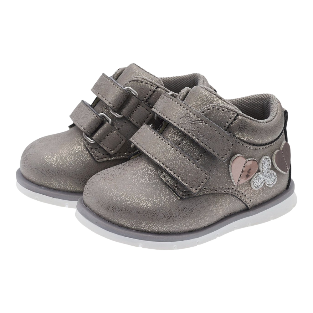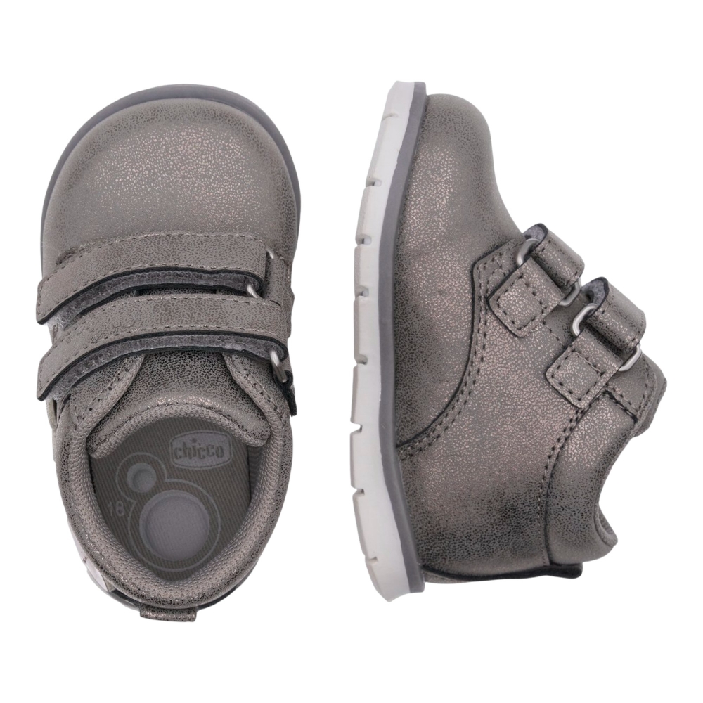 in pelle laminata color acciaio uniscono stile e comfort per i primi movimenti del bambino. Morbide e leggere, sono pensate per accompagnare il piede nella fase del gattonamento garantendo flessibilità e protezione. La suola antiscivolo e la chiusura pratica rendono la calzata facile e sicura.
