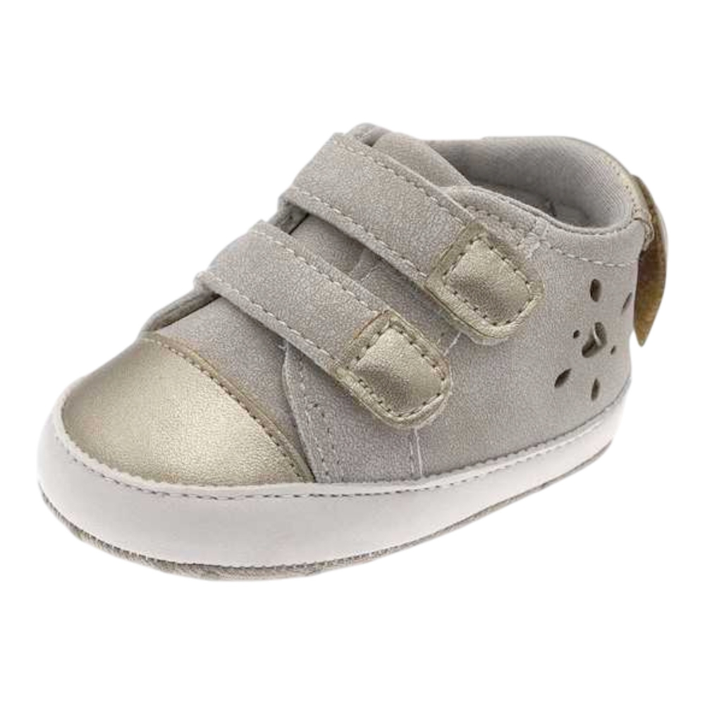 in morbido nabuk con dettagli laminati oro uniscono eleganza e comfort per i primi passi. Appartenenti alla linea