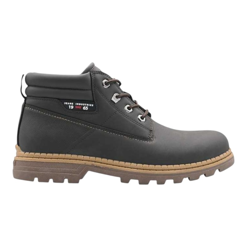 Polacchino in simil nubuk, linguetta, chiusura con lacci, punta tonda, tallone rinforzato, suola in gomma.