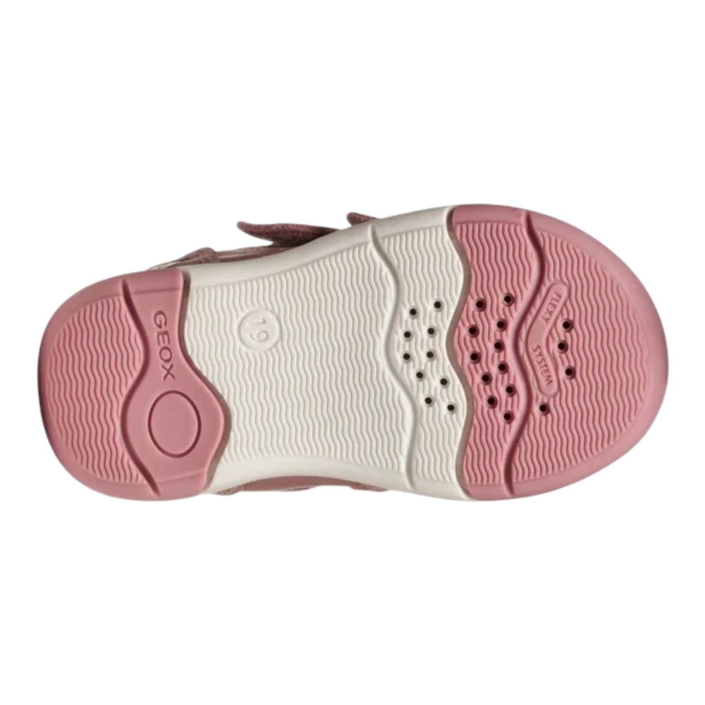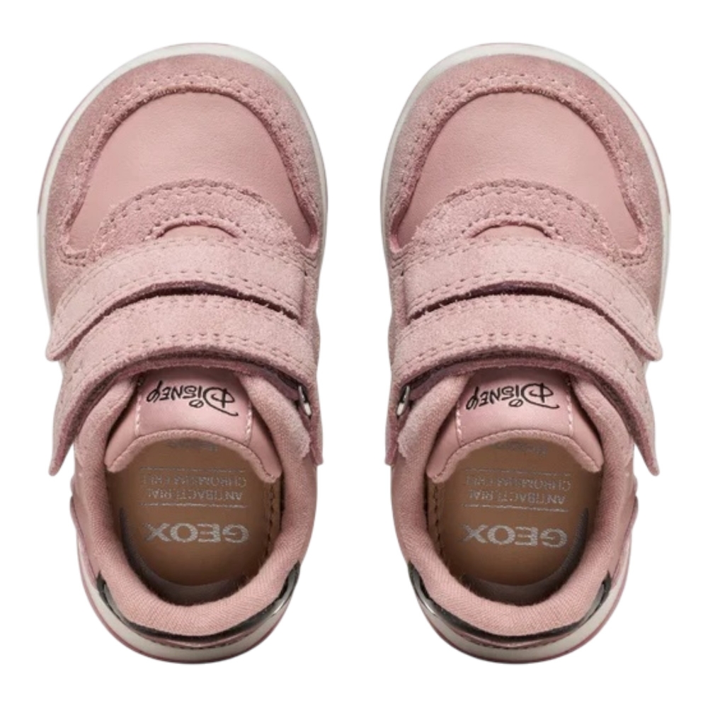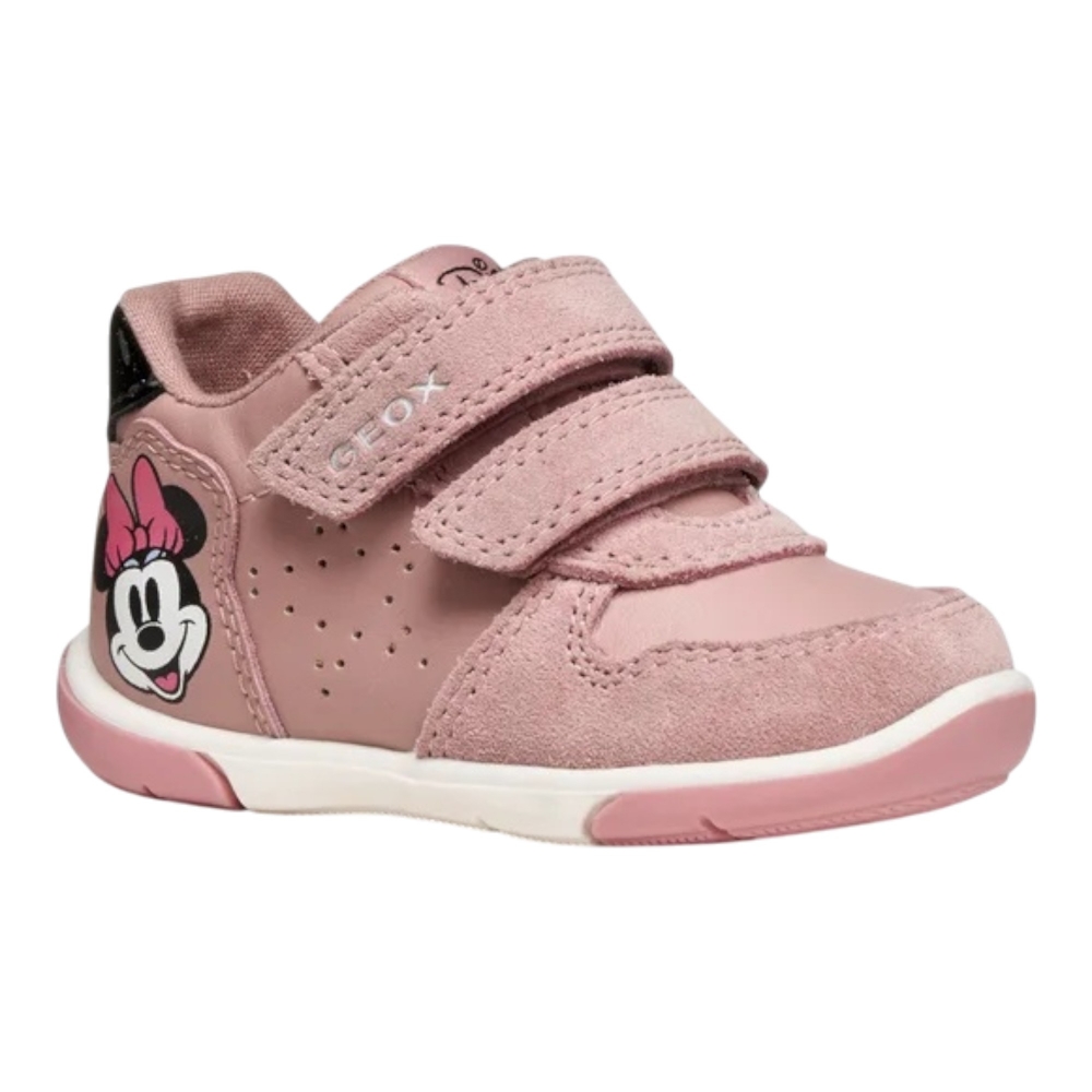 Sneakers in vera pelle e suede, linguetta con patch logo, fettucce in velcro, grafica Disney con Minnie, fori traspiranti laterali, suola realizzata con tecnologia Respira, suola in gomma.