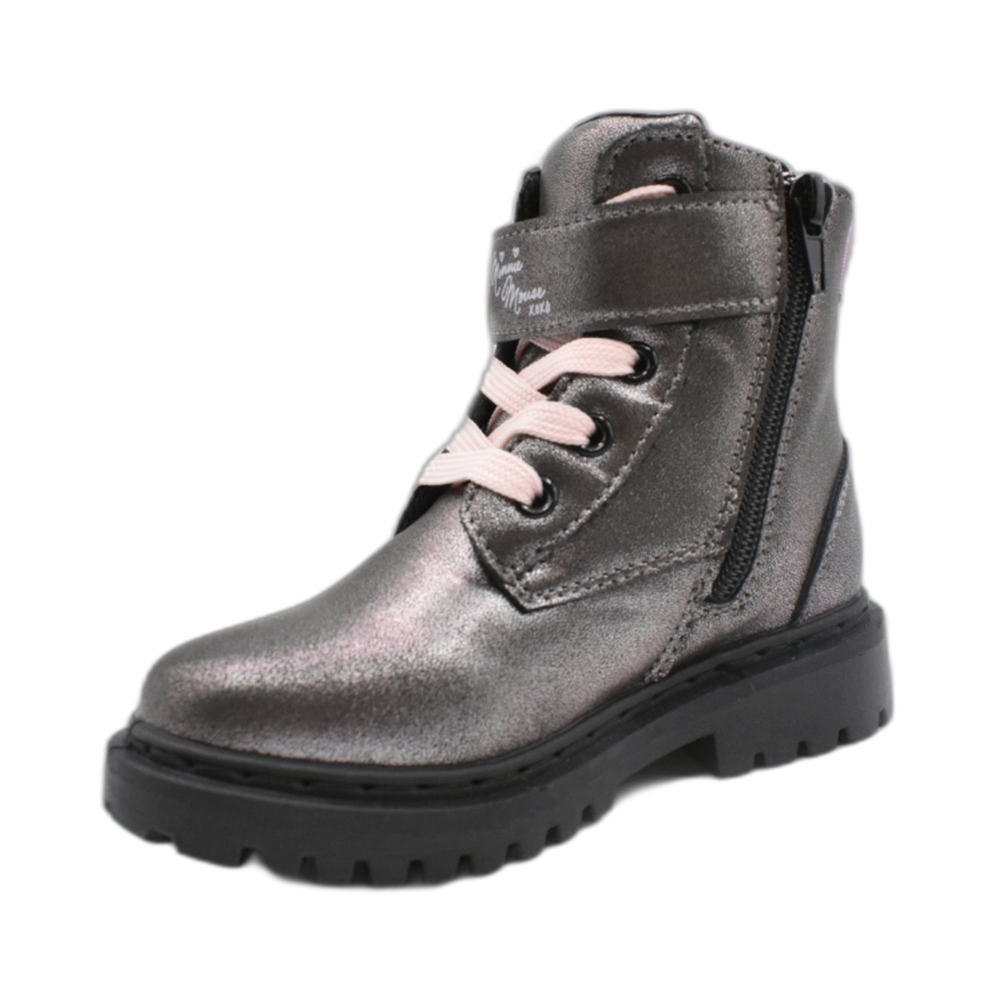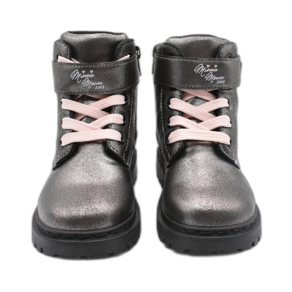 Polacchino in similpelle, linguetta, chiusura con lacci, fettuccia con fibbia, patch laterale di Minnie, tirante posteriore, suola in gomma a trattore.