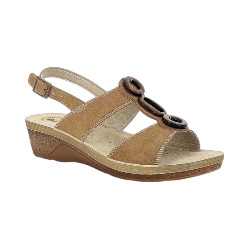 Sandalo in tessuto sintetico, con dettaglio decorativo applicato, cinturino posteriore con fibbia regolabile, sottopiede traspirante, suola in sughero.