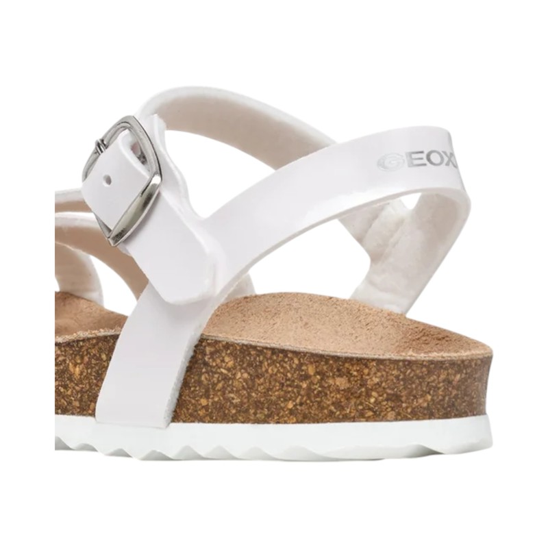 Sandalo in similpelle verniciata, 3 fettucce, cinturino alla caviglia con fibbia regolabile, sottopiede scamosciato realizzato con tecnologia Respira, suola in gomma e sughero.