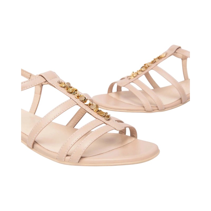 Sandalo in vera pelle con dettagli in metallo applicati, fettucce, passante e cinturino alla caviglia regolabile, sottopiede in pelle, suola in gomma, Made in Italy.