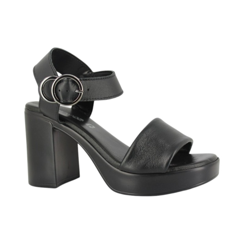 Sandalo in similpelle laminata, fascia con dettaglio in metallo, fettucce, sottopiedde in vera pelle, suola con zeppa.