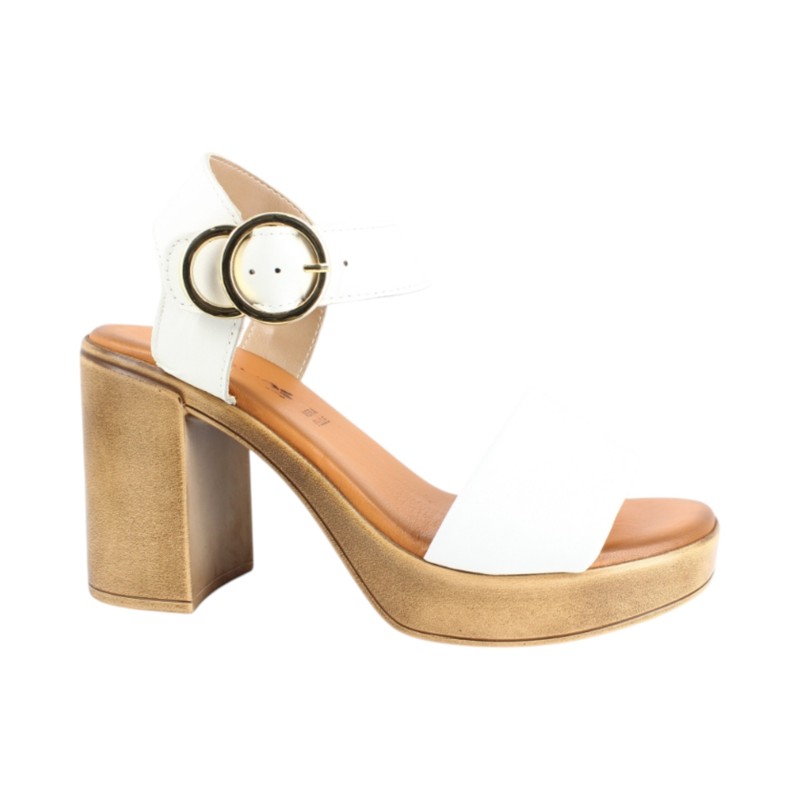 Sandalo in pelle nappa, fascia in velcro, cinturino alla caviglia in velcro, fettuccia posteriore, sottopiede in pelle scamosciata, suola con zeppa.