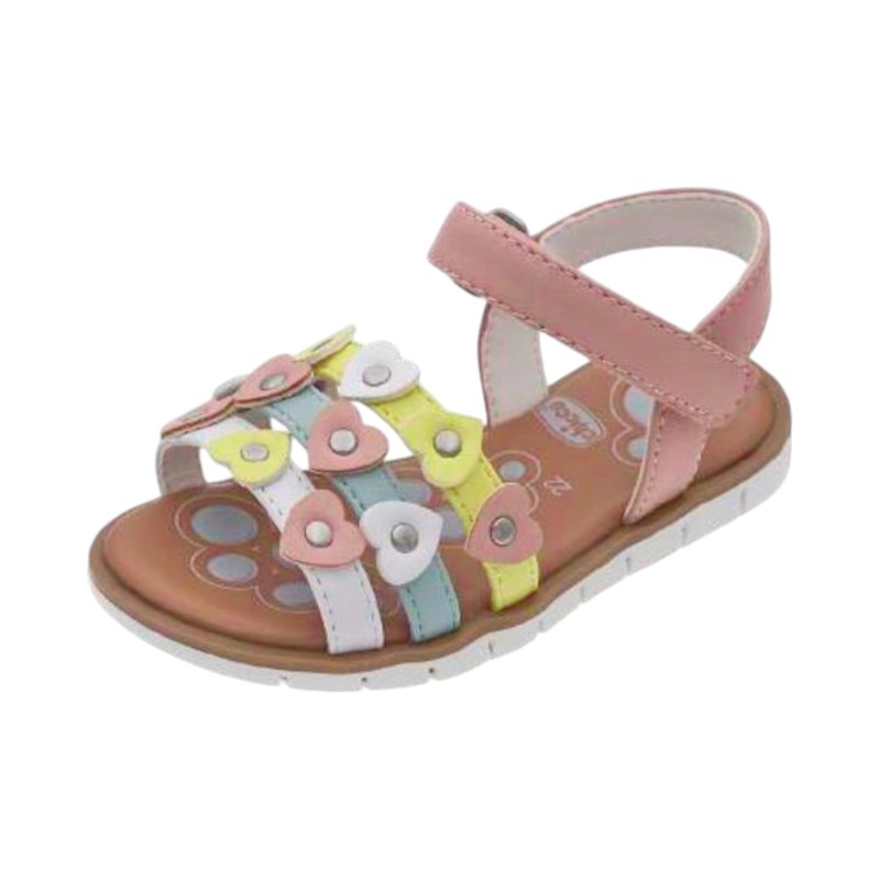 Sandalo in similpelle, fascia con fettucce e patch a cuore, cinturino alla caviglia in velcro, suola in gomma.