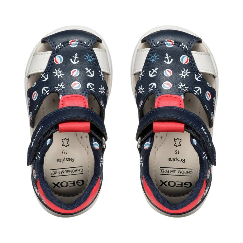Sandalo in similpelle con stampa grafica all over, passante e fettuccia in velcro con logo inciso, sottopiede realizzato con tecnolgia Respira, suola in gomma.