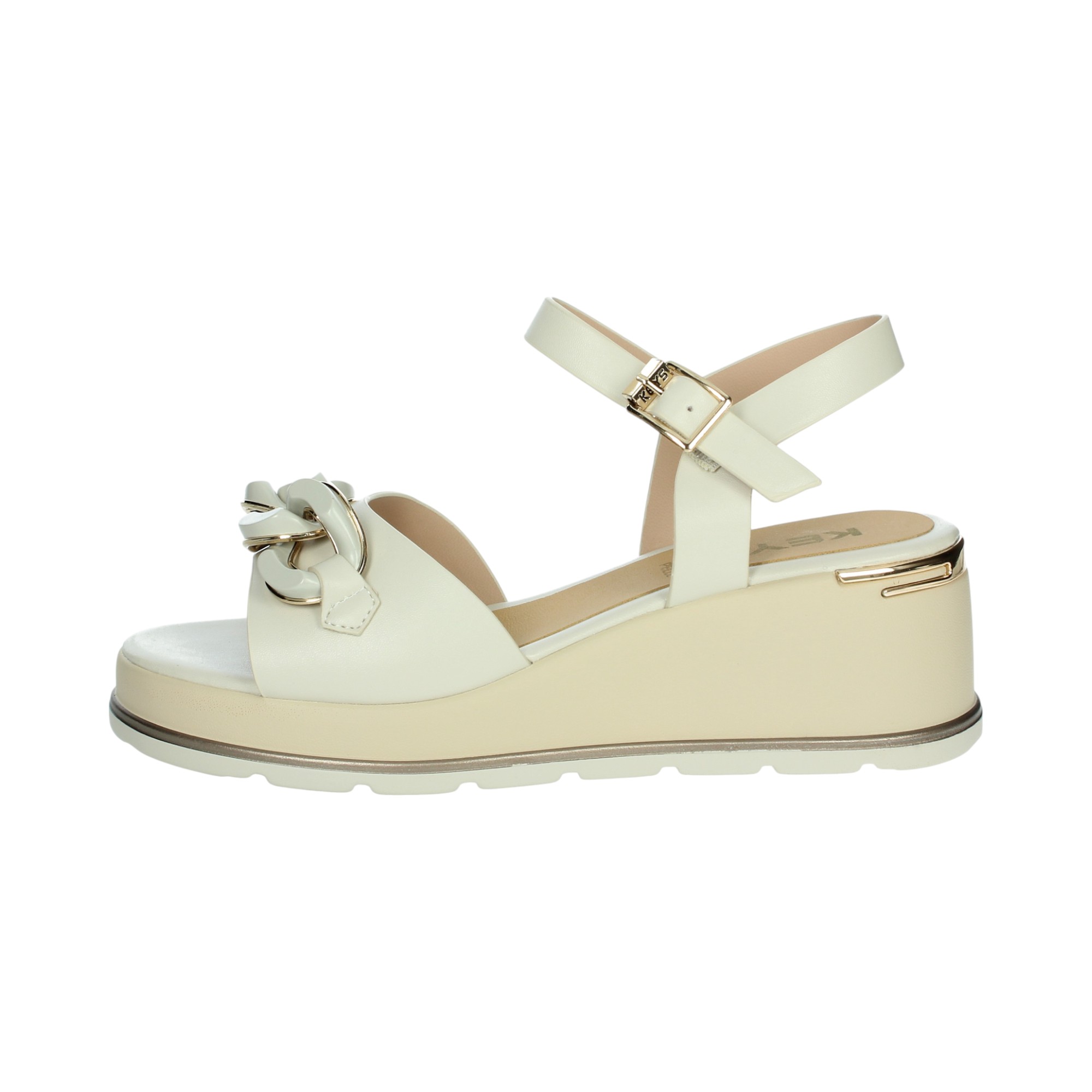 Sandalo in similpelle, fascia con dettaglio in metallo, cinturino alla caviglia con fibbia regolabile, sottopiede in pelle, suola con zeppa.