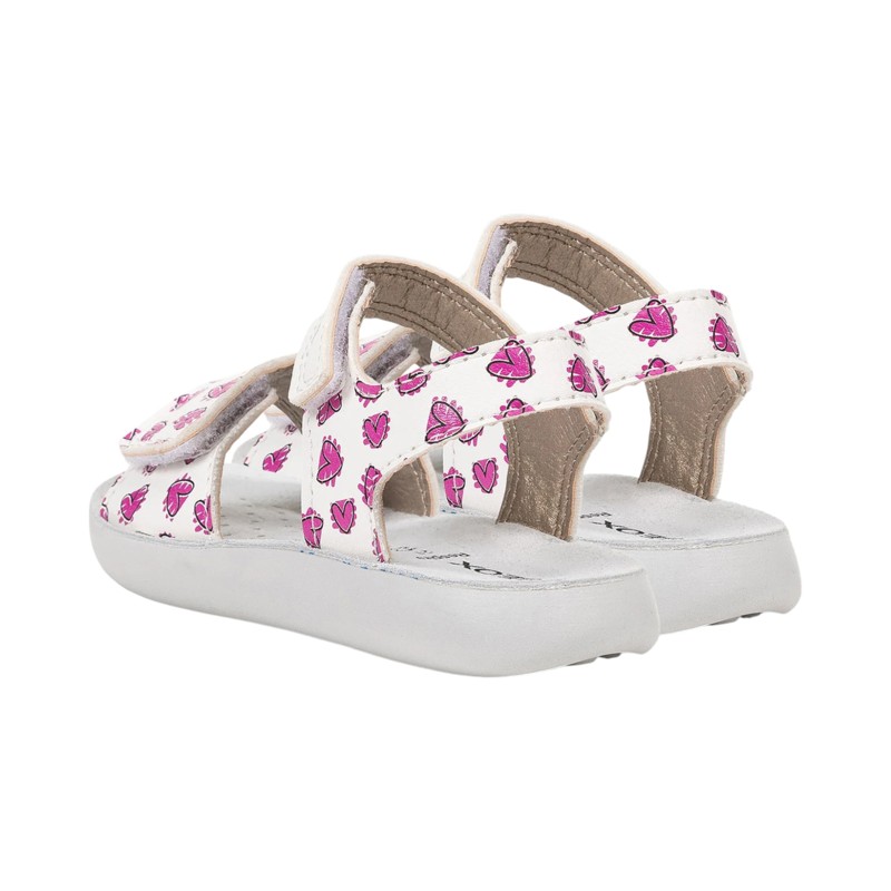 Sandalo in similpelle con stampa cuori all over, fascia, fettuccia in velcro con logo a contrasto, sottopiede realizzato con tecnologia Respira, suola in gomma.