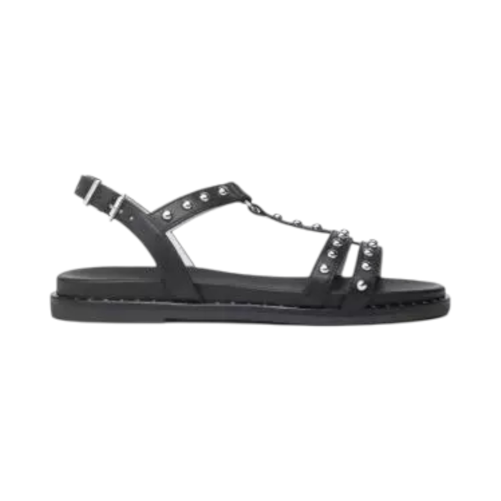 Sandalo in vera pelle, borchie applicate, fascia con fettucce, cinturino posteriore con fibbia, suola in gomma.