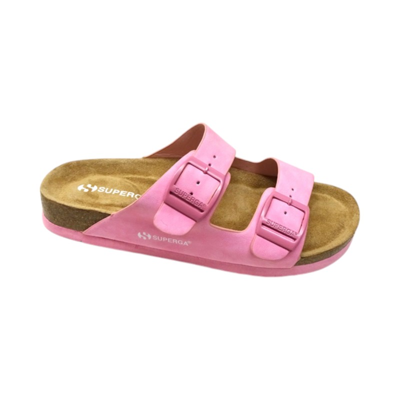 Ciabatta in simil nubuk, doppia fettuccia con fibbia regolabile, sottopiede in camoscio, suola in sughero e gomma.