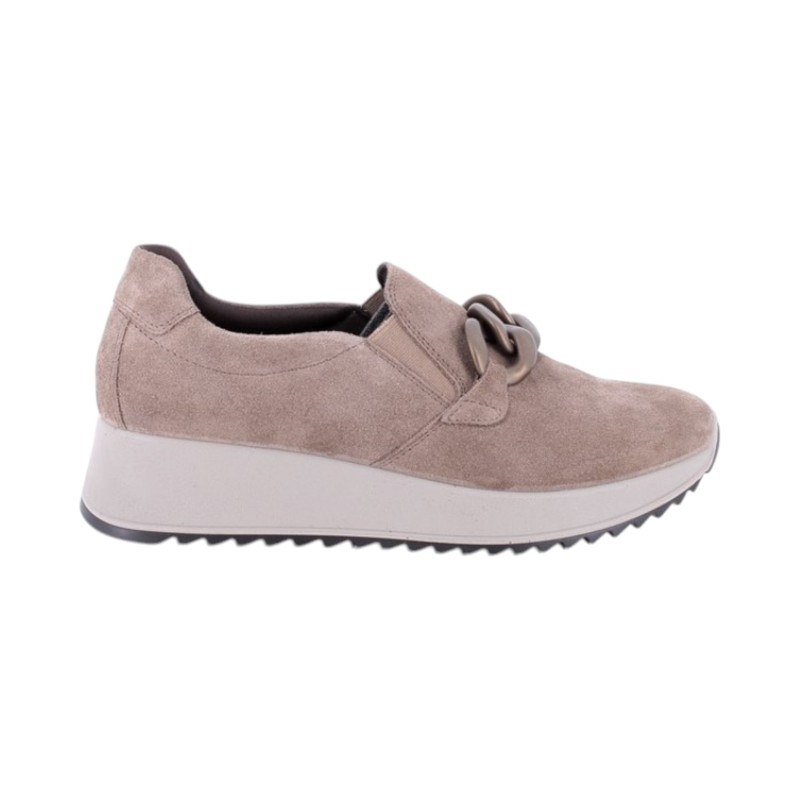 Mocassino in vero camoscio, punta tonda, dettaglio in metallo applicato, bande laterali elasticizzate, punta tonda, tallone rinforzato, suola in gomma.