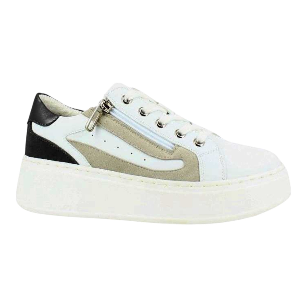 Sneakers in vera pelle, linguetta, chiusura con lacci, zip laterale, profili in suede, tallone rinforzato, suola in gomma.