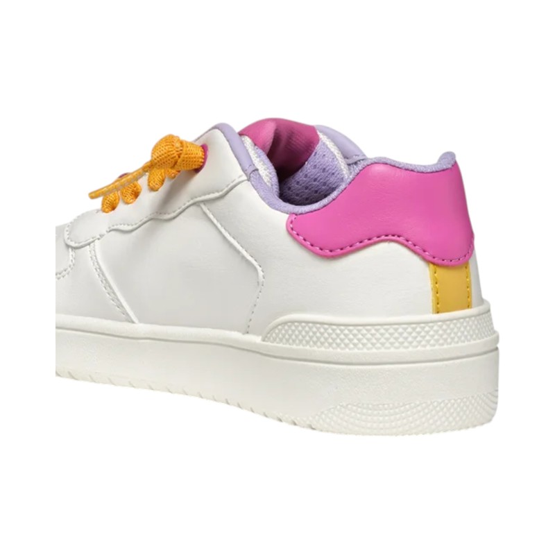Sneakers in similpelle, linguetta con patch logo, interni in mesh, punta tonda con fori traspiranti, tallone rinforzato a contrasto, chiusura con lacci e charms decorativi applicati, intersuola realizzata con tecnologia Respira, suola in gomma.
