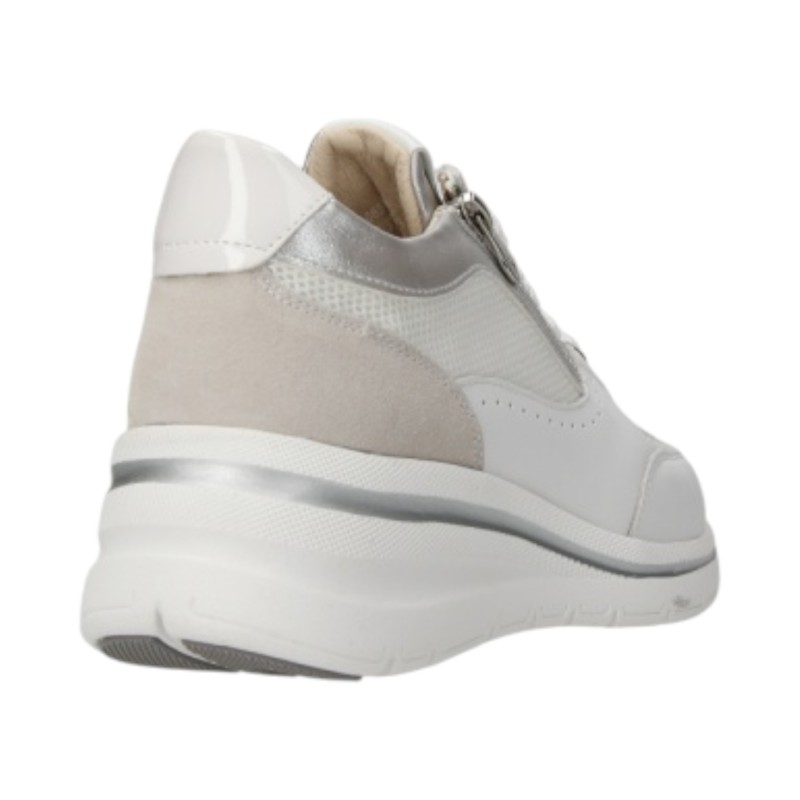 Sneakers in vera pelle e mesh, profili laminati, linguetta con patch logo, chiusura con lacci, zip laterale decorativa, punta tonda, suola in gomma.
