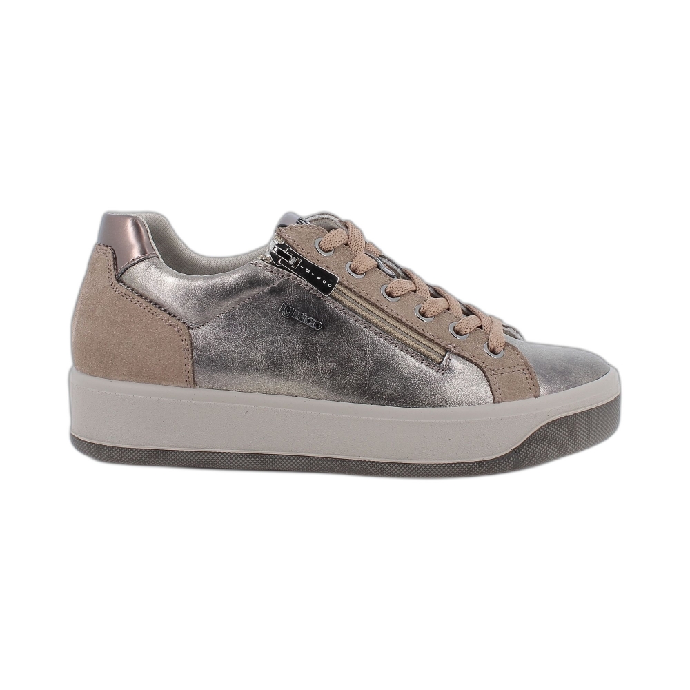 Queste sneakers Igi&Co da donna combinano pelle liscia, inserti laminati e camoscio in una raffinata tonalità taupe, creando un look moderno e ricercato. La struttura morbida avvolge il piede assicurando comfort per tutta la giornata, mentre i dettagli luminosi aggiungono un tocco femminile ideale per valorizzare i look invernali con stile e versatilità.