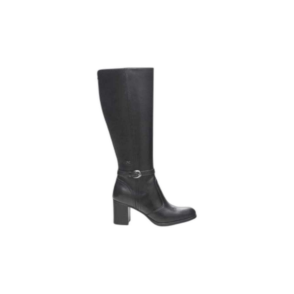 Stivale alto in vera pelle, fettuccia con fibbia in metallo, chiusura con zip laterale, punta tonda, suola con tacco.