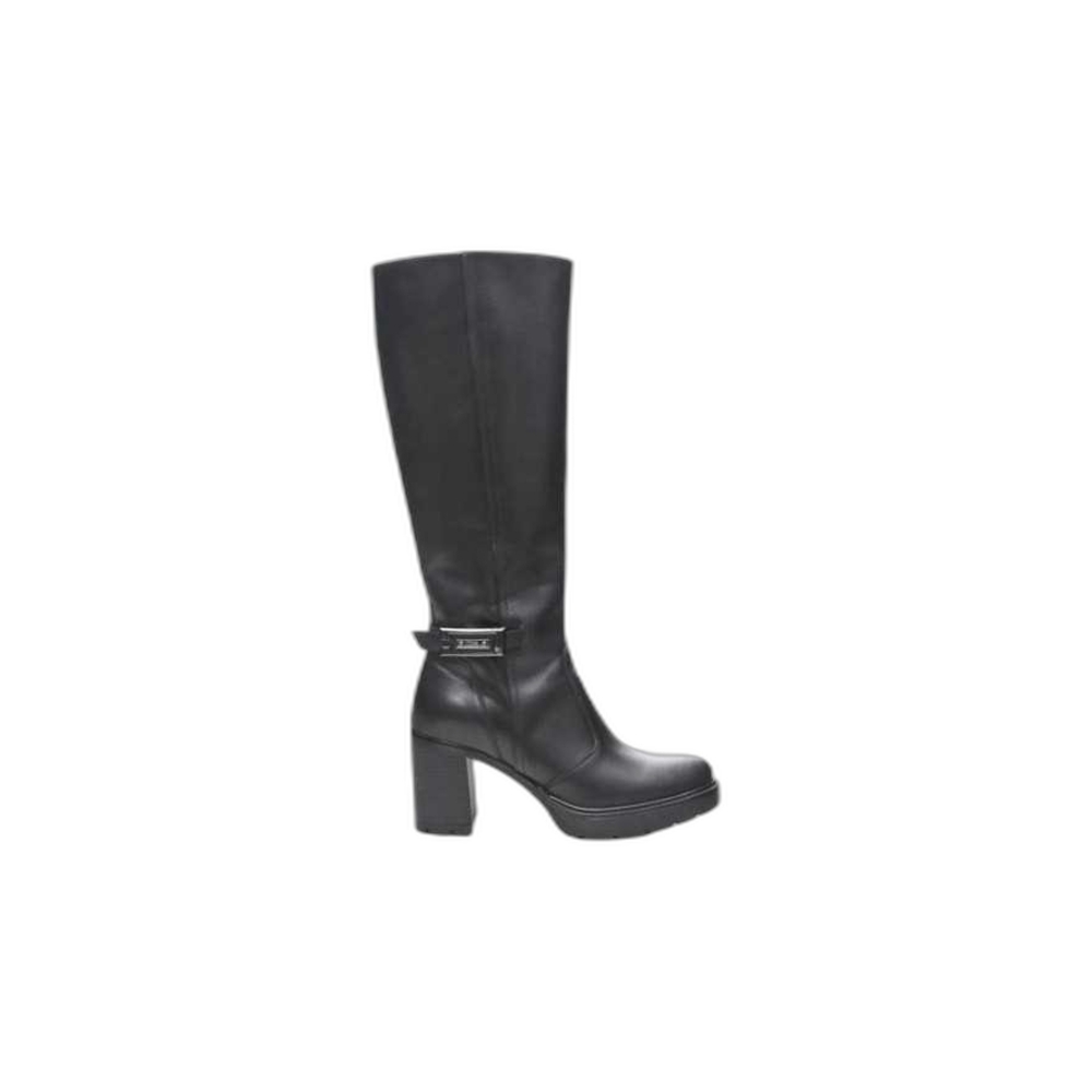 Stivale in vera pelle, gambale alto, fettuccia in metallo, punta tonda, chiusura con zip, tacco alto.
