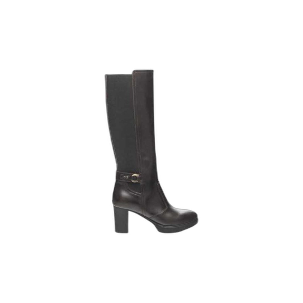 Stivale in vera pelle, gambale alto, fettuccia con logo, chiusura con zip laterale, punta tonda, tallone rinforzato, suola con tacco alto.