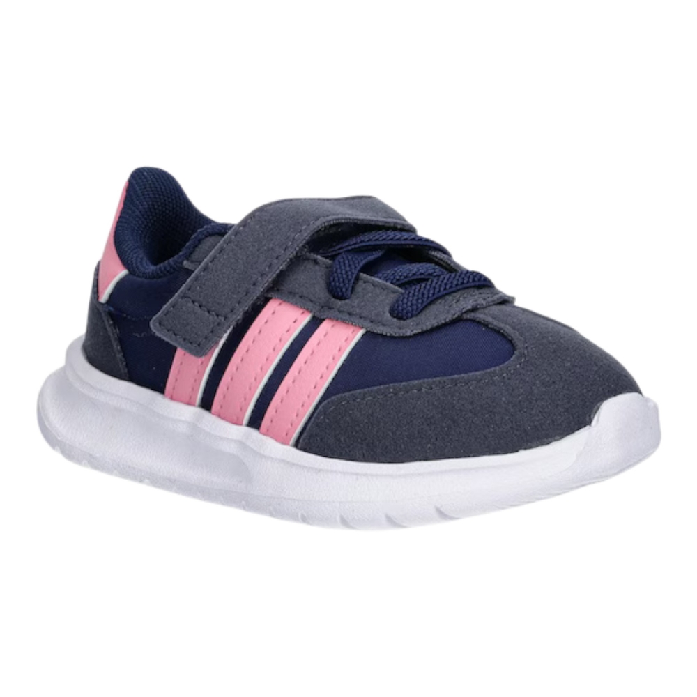 Le adidas Run 70s 2.0 EL I sono sneakers dal fascino rétro pensate per accompagnare i più piccoli nelle loro prime avventure quotidiane. Realizzate in un mix di pelle scamosciata (suede) e tessuto tecnico traspirante, offrono una calzata morbida e confortevole, ideale per il piedino dei bambini. La chiusura con strappi e lacci elastici permette di indossarle facilmente e garantisce una tenuta sicura durante il movimento. La palette dark blue con dettagli bliss pink e navy aggiunge un tocco vivace e moderno, perfetto per ogni look casual o sportivo. Leggere, resistenti e dallo stile intramontabile, queste sneakers riflettono tutta la qualità e l’heritage adidas, unendo comfort, praticità e design in un modello pensato per i piccoli esploratori di oggi.
