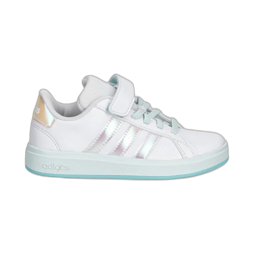 Sneakers in similpelle, linguetta, chiusura con lacci, fettuccia in velcro, 3 iconiche stripes laterali iridescenti, punta tonda, tallone rinforzato, suola in gomma.