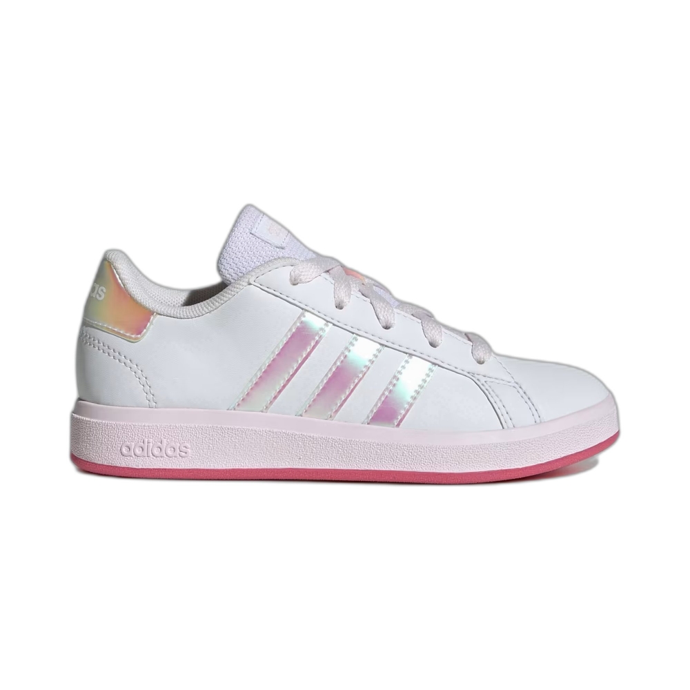 Sneakers in similpelle, linguetta con patch logo, chiusura con lacci, 3 iconiche stripes iridescenti, tallone rinforzato, suola in gomma.