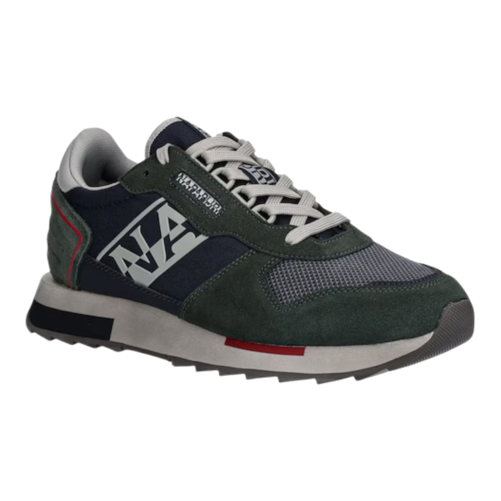 Sneakers in simil nubuk e tessuto, linguetta con patch logo, chiusura con lacci, logo laterale intagliato, banda laterale logata a contrasto, tallone rinorzato, interno in mesh, suola in gomma.