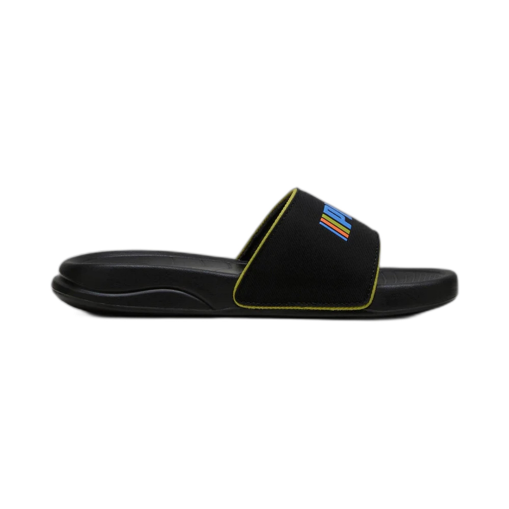 Ciabatta in gomma, fascia con logo a contrasto, suola in gomma.