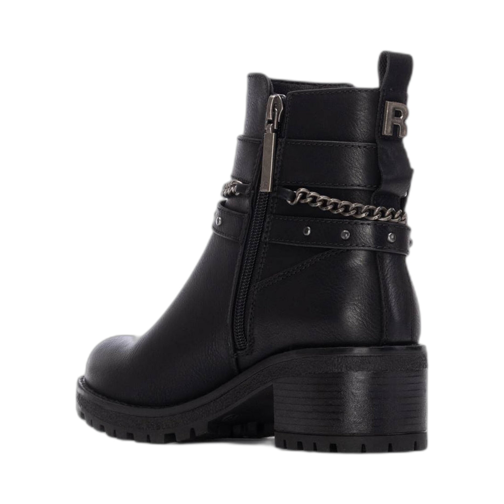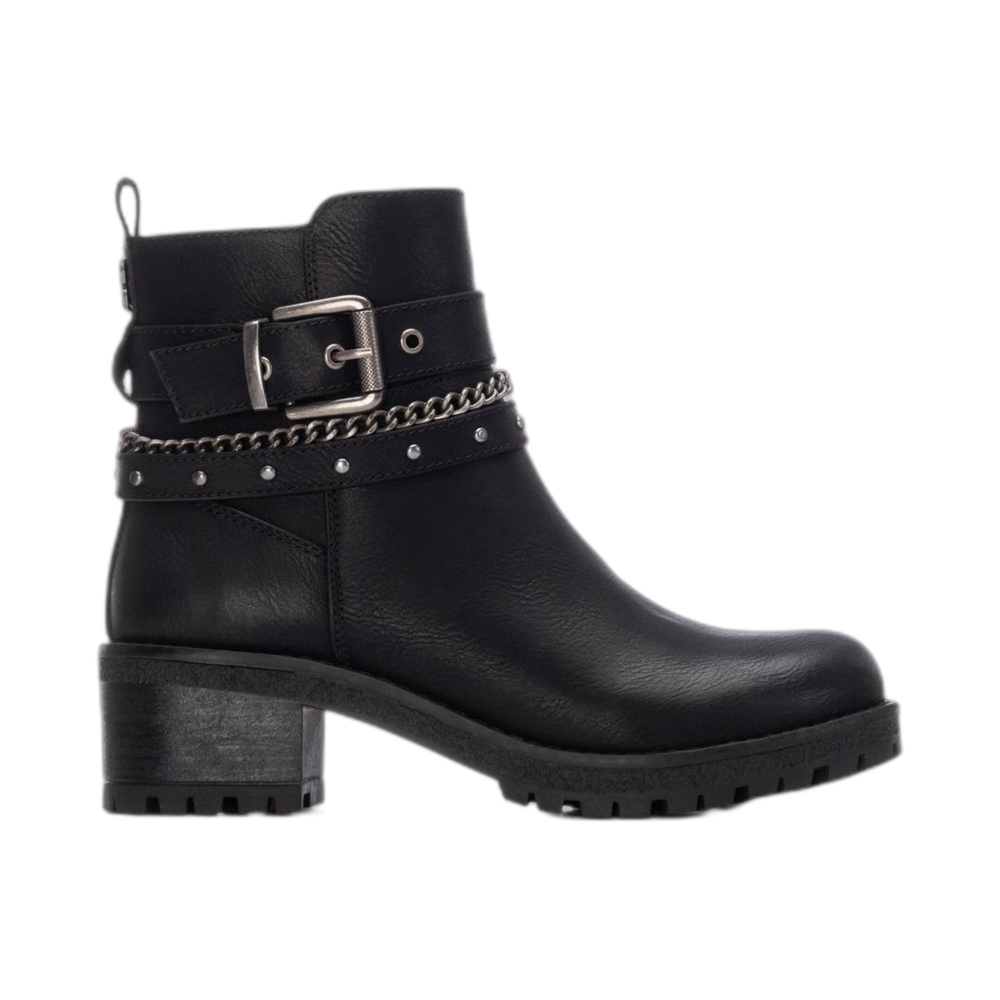 Tronchetto in similpelle, fettuccia con fibbia, punta tonda, tallone rinforzato, suola in gomma.
