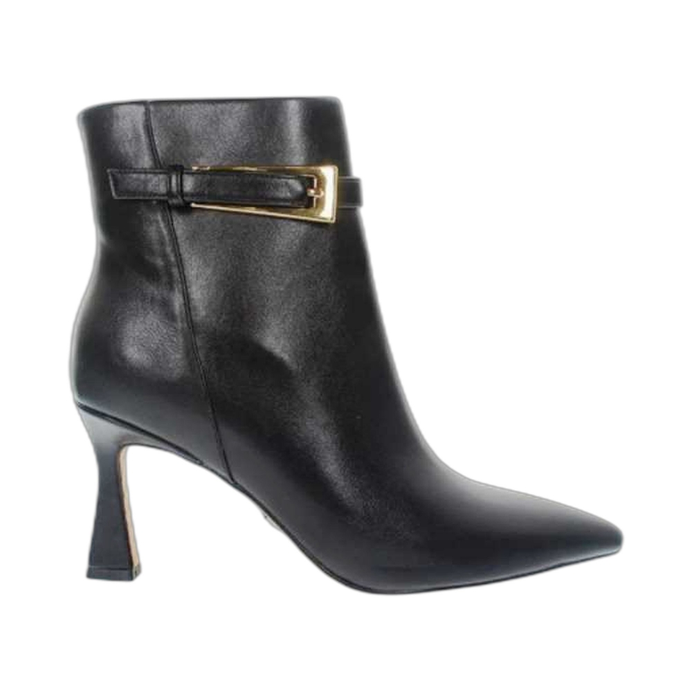 Tronchetto in similpelle, punta ovale, cinturino decorativo con fibbia dorata, chiusura con zip, tacco svasato.