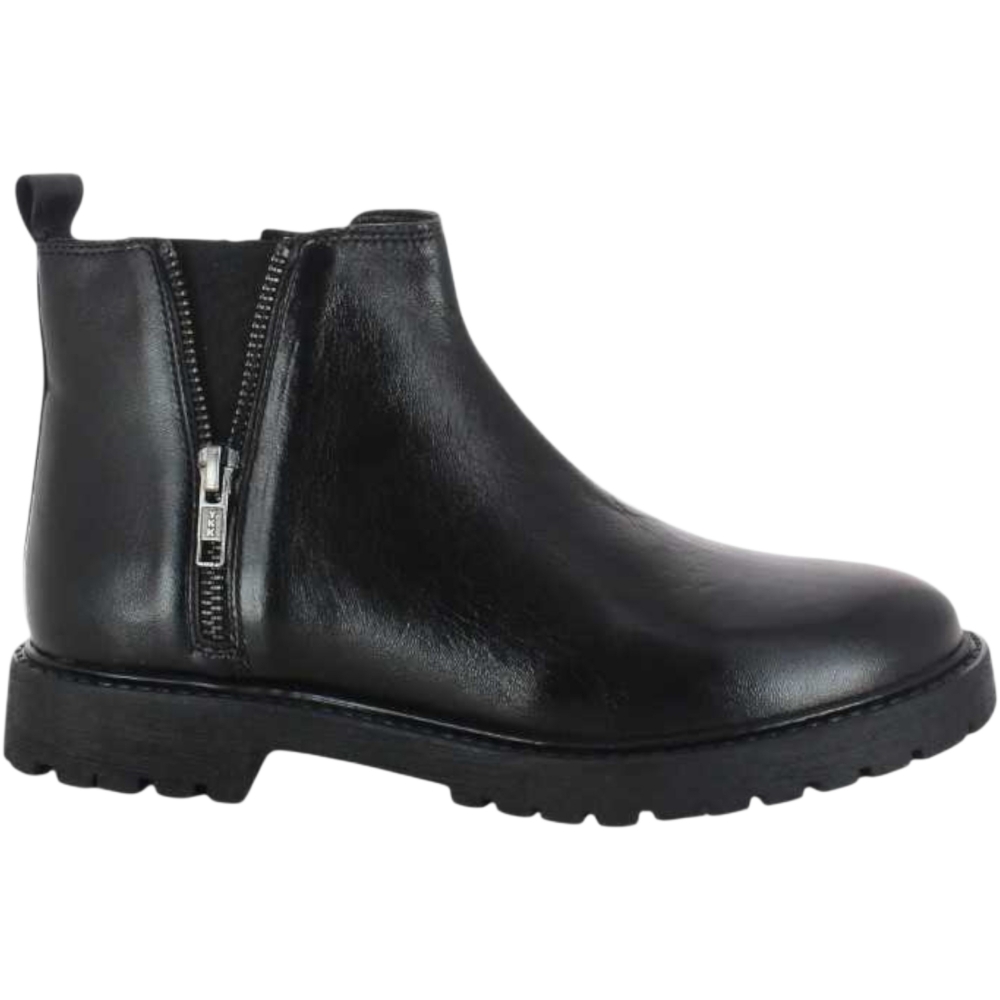 Scarponcino in vera pelle, punta tonda, chiusura con zip laterale, tallone rinforzato, suola in gomma.