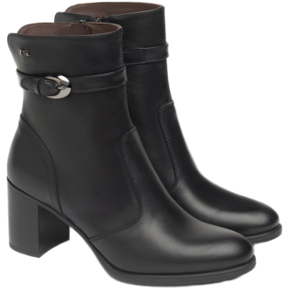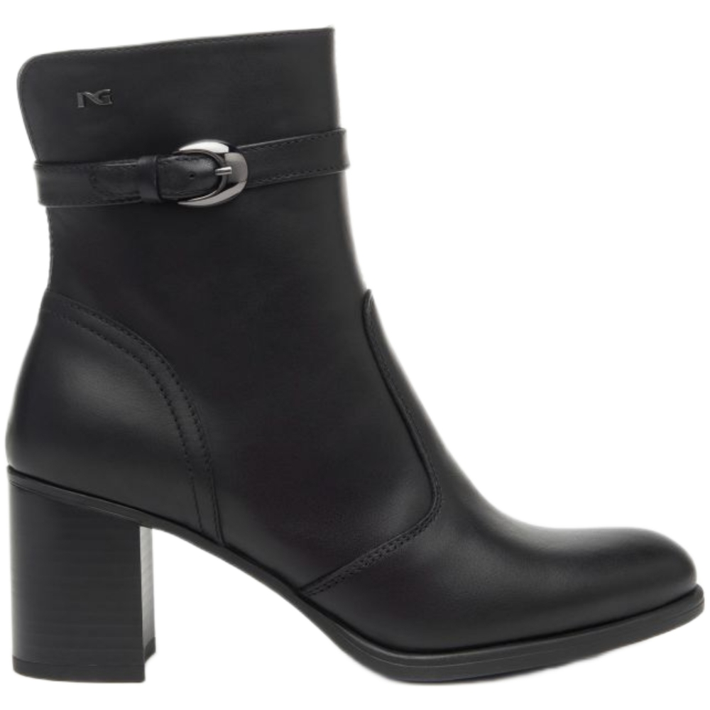 Tronchetto in vera pelle, cinturino con fibbia, logo in metallo, chiusura con zip laterale, punta tonda, tacco alto.