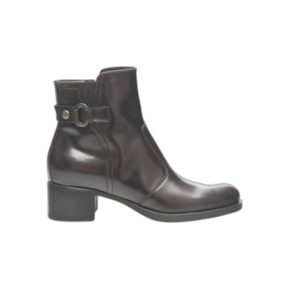 Tronchetto in vera pelle, punta tonda, tallone rinforzato, chiusura con zip laterale, tacco medio.