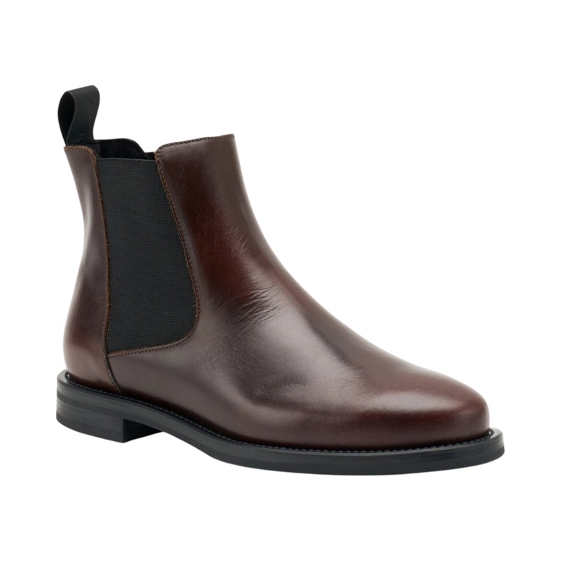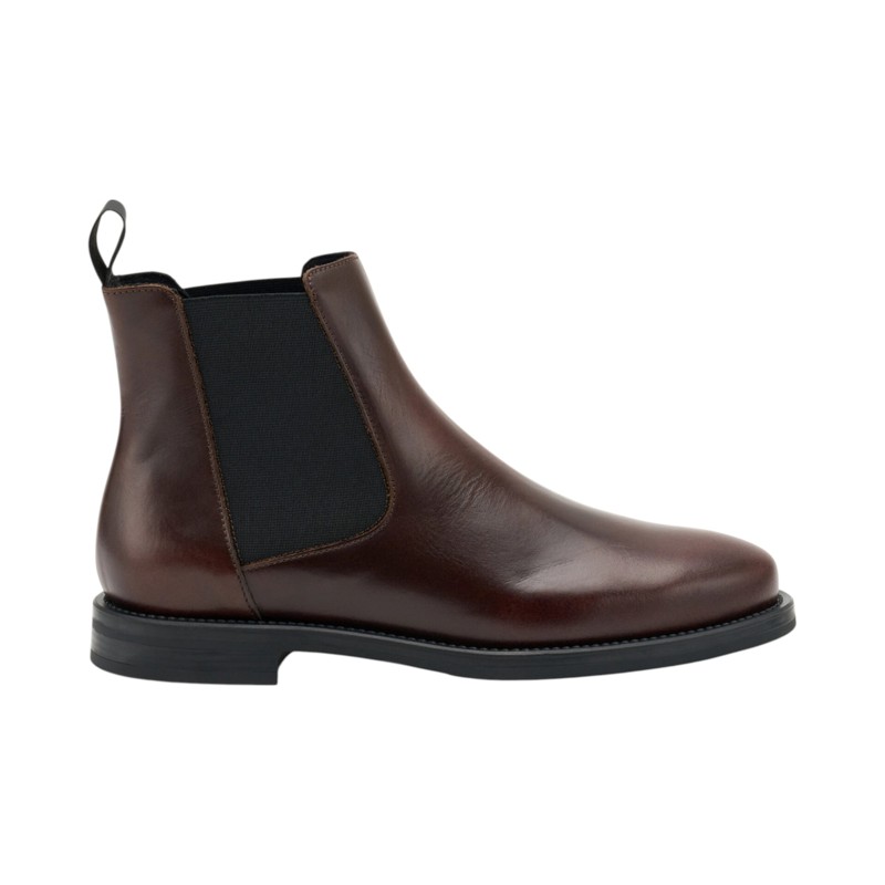 Tronchetto in vera pelle, punta tonda, tallone rinforzato, bande laterali elasticizzate, tallone rinforzato, suola in gomma.