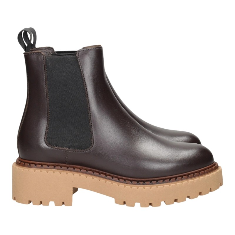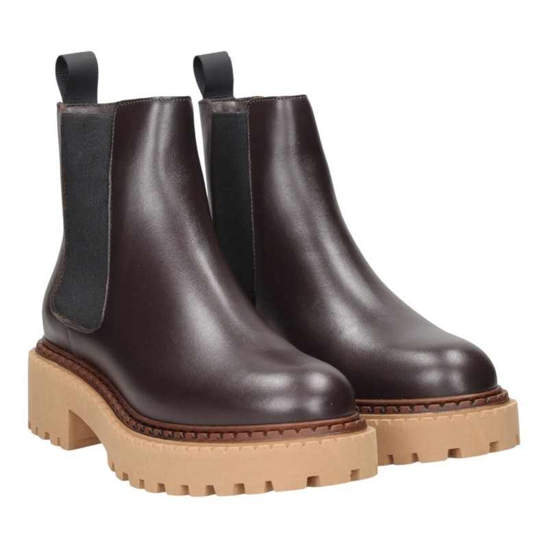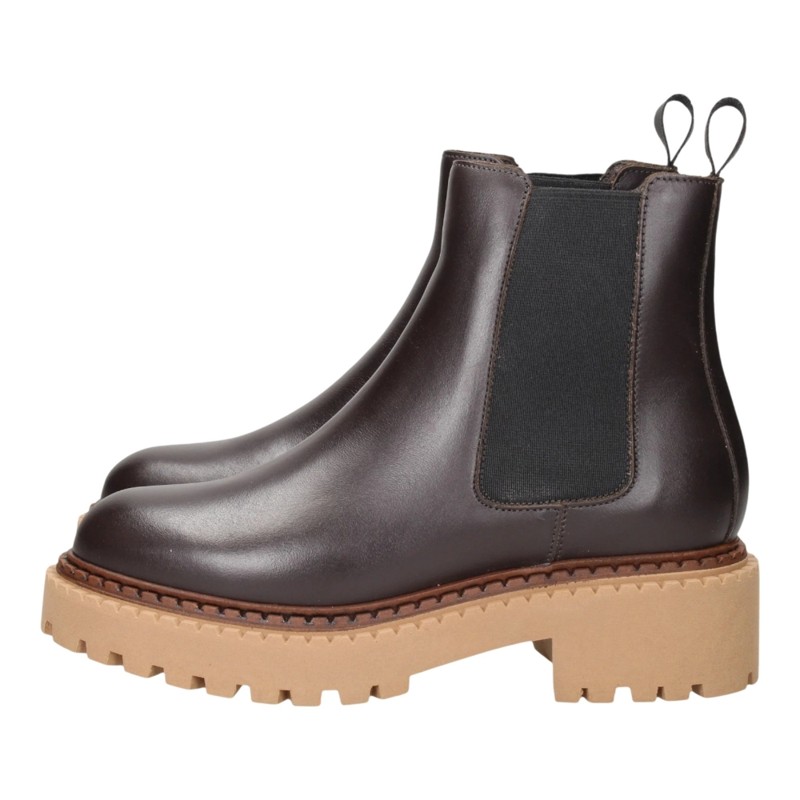 Tronchetto in vera pelle, bande laterali elasticizzate, punta tonda, tirante posteriore, tallone rinfozato, suola in gomma a trattore.
