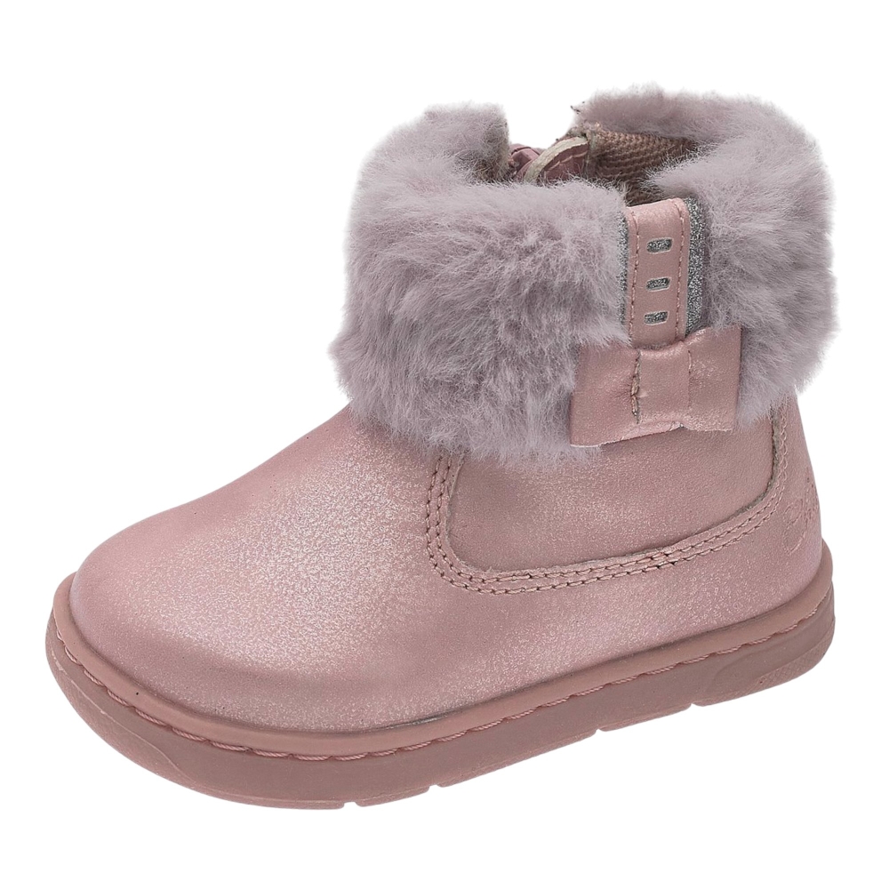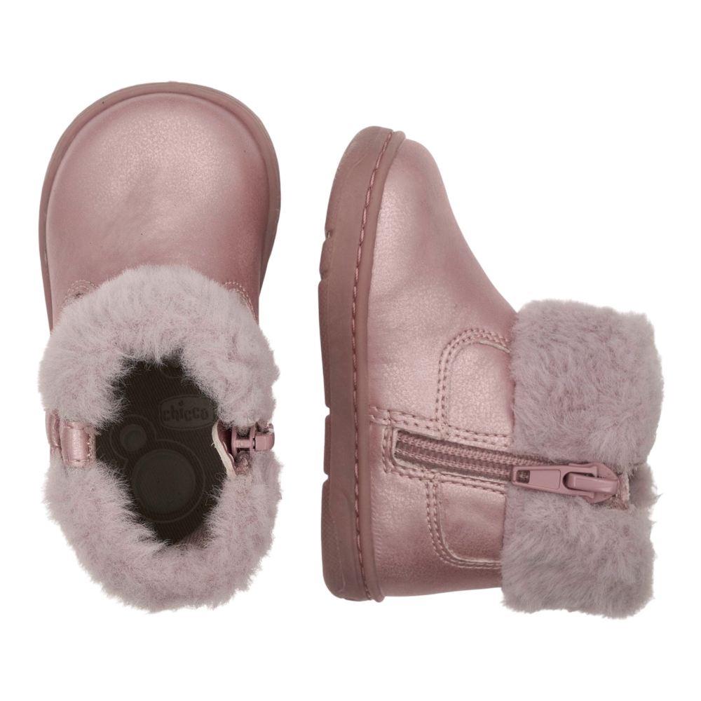 in pelle laminata rosa con bordo in pelliccia sono perfetti per tenere al caldo i piedini nelle prime esplorazioni. Morbidi e confortevoli, offrono protezione e flessibilità ideali per la fase del gattonamento. La suola antiscivolo assicura stabilità su ogni superficie.